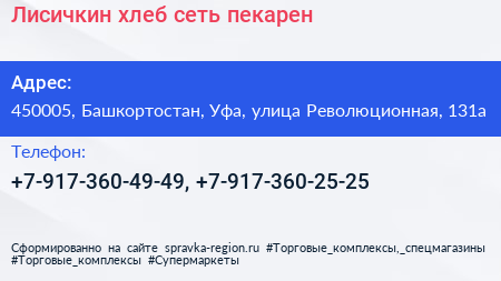 Лисичкин хлеб, сеть пекарен по адресу 450005, Башкортостан, Уфа, улица Революционная, 131а в дальнейшем Организация, размещена в следующих категориях:
