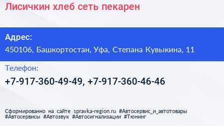 Лисичкин хлеб, сеть пекарен по адресу 450106, Башкортостан, Уфа, Степана Кувыкина, 11 в дальнейшем Организация, размещена в следующих категориях: