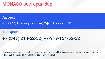 MONACO, ресторан-бар по адресу 450077, Башкортостан, Уфа, Ленина, 30 в дальнейшем Организация, размещена в следующих категориях: