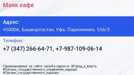 Маяк, кафе по адресу 450006, Башкортостан, Уфа, Пархоменко, 156/3 в дальнейшем Организация, размещена в следующих категориях: