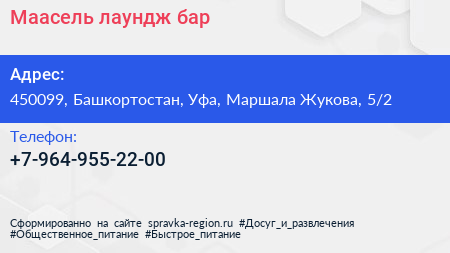 Маасель, лаундж-бар по адресу 450099, Башкортостан, Уфа, Маршала Жукова, 5/2 в дальнейшем Организация, размещена в следующих категориях: