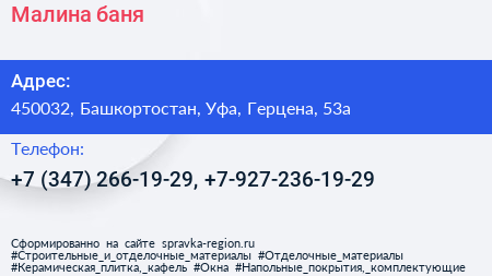 Малина, баня по адресу 450032, Башкортостан, Уфа, Герцена, 53а в дальнейшем Организация, размещена в следующих категориях: