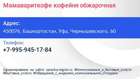 Мамавариткофе, кофейня-обжарочная по адресу 450076, Башкортостан, Уфа, Чернышевского, 60 в дальнейшем Организация, размещена в следующих категориях: