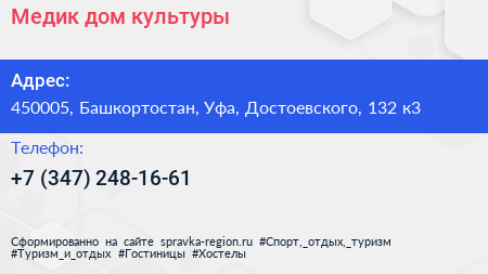 Медик, дом культуры по адресу 450005, Башкортостан, Уфа, Достоевского, 132 к3 в дальнейшем Организация, размещена в следующих категориях: