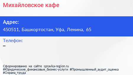 Михайловское, кафе по адресу 450511, Башкортостан, Уфа, Ленина, 65 в дальнейшем Организация, размещена в следующих категориях: