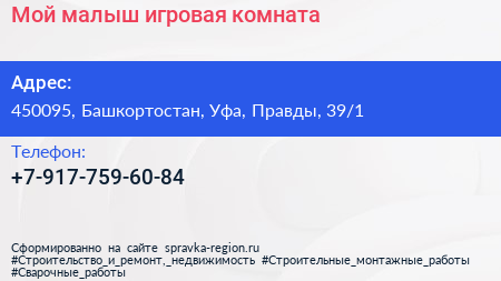 Мой малыш, игровая комната по адресу 450095, Башкортостан, Уфа, Правды, 39/1 в дальнейшем Организация, размещена в следующих категориях: