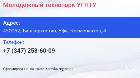 Молодежный технопарк, УГНТУ по адресу 450062, Башкортостан, Уфа, Космонавтов, 4 в дальнейшем Организация, размещена в следующих категориях: