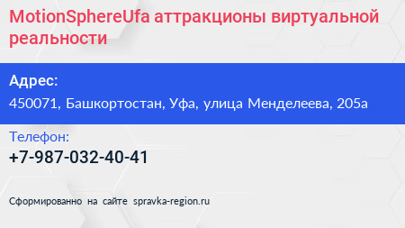 MotionSphereUfa, аттракционы виртуальной реальности по адресу 450071, Башкортостан, Уфа, улица Менделеева, 205а в дальнейшем Организация, размещена в следующих категориях: