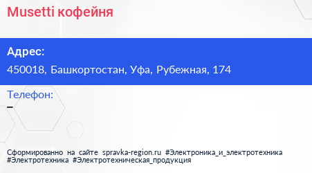 Musetti, кофейня по адресу 450018, Башкортостан, Уфа, Рубежная, 174 в дальнейшем Организация, размещена в следующих категориях: