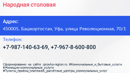 Народная, столовая по адресу 450005, Башкортостан, Уфа, улица Революционная, 70/1 в дальнейшем Организация, размещена в следующих категориях: