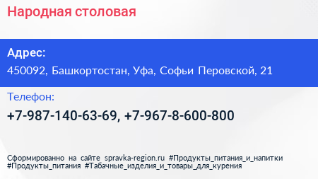 Народная, столовая по адресу 450092, Башкортостан, Уфа, Софьи Перовской, 21 в дальнейшем Организация, размещена в следующих категориях: