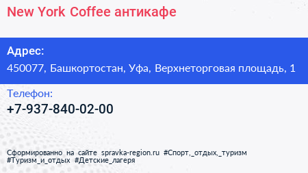 New York Coffee, антикафе по адресу 450077, Башкортостан, Уфа, Верхнеторговая площадь, 1 в дальнейшем Организация, размещена в следующих категориях: