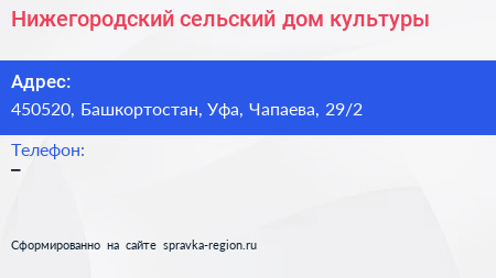 Нижегородский сельский дом культуры по адресу 450520, Башкортостан, Уфа, Чапаева, 29/2 в дальнейшем Организация, размещена в следующих категориях: