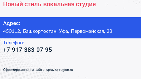 Новый стиль, вокальная студия по адресу 450112, Башкортостан, Уфа, Первомайская, 28 в дальнейшем Организация, размещена в следующих категориях: