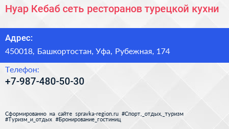 Нуар Кебаб, сеть ресторанов турецкой кухни по адресу 450018, Башкортостан, Уфа, Рубежная, 174 в дальнейшем Организация, размещена в следующих категориях: