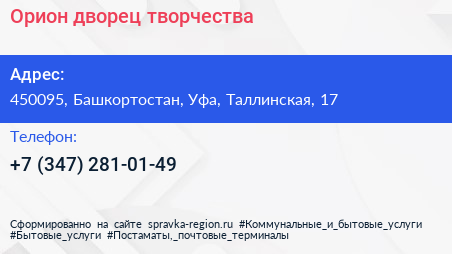 Орион, дворец творчества по адресу 450095, Башкортостан, Уфа, Таллинская, 17 в дальнейшем Организация, размещена в следующих категориях:
