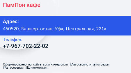 ПамПон, кафе по адресу 450520, Башкортостан, Уфа, Центральная, 221а в дальнейшем Организация, размещена в следующих категориях: