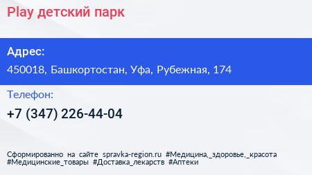 Play, детский парк по адресу 450018, Башкортостан, Уфа, Рубежная, 174 в дальнейшем Организация, размещена в следующих категориях: