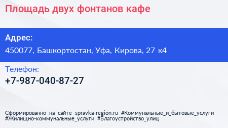 Площадь двух фонтанов, кафе по адресу 450077, Башкортостан, Уфа, Кирова, 27 к4 в дальнейшем Организация, размещена в следующих категориях: