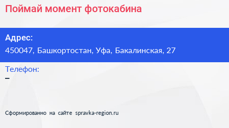 Поймай момент, фотокабина по адресу 450047, Башкортостан, Уфа, Бакалинская, 27 в дальнейшем Организация, размещена в следующих категориях: