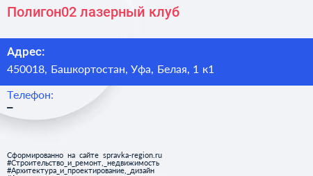 Полигон02, лазерный клуб по адресу 450018, Башкортостан, Уфа, Белая, 1 к1 в дальнейшем Организация, размещена в следующих категориях: