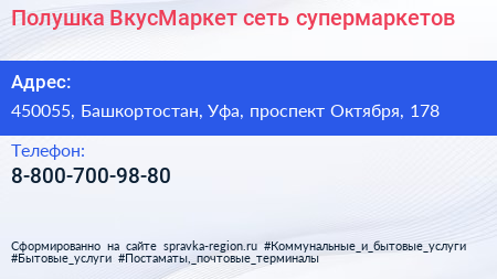 Полушка ВкусМаркет, сеть супермаркетов по адресу 450055, Башкортостан, Уфа, проспект Октября, 178 в дальнейшем Организация, размещена в следующих категориях: