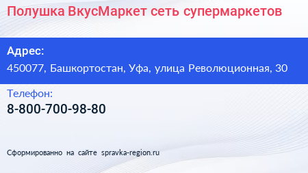 Полушка ВкусМаркет, сеть супермаркетов по адресу 450077, Башкортостан, Уфа, улица Революционная, 30 в дальнейшем Организация, размещена в следующих категориях: