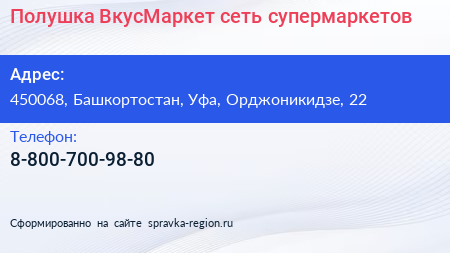 Полушка ВкусМаркет, сеть супермаркетов по адресу 450068, Башкортостан, Уфа, Орджоникидзе, 22 в дальнейшем Организация, размещена в следующих категориях:
