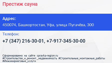 Престиж, сауна по адресу 450074, Башкортостан, Уфа, улица Пугачёва, 300 в дальнейшем Организация, размещена в следующих категориях:
