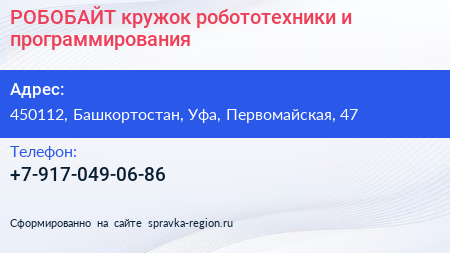 РОБОБАЙТ, кружок робототехники и программирования по адресу 450112, Башкортостан, Уфа, Первомайская, 47 в дальнейшем Организация, размещена в следующих категориях: