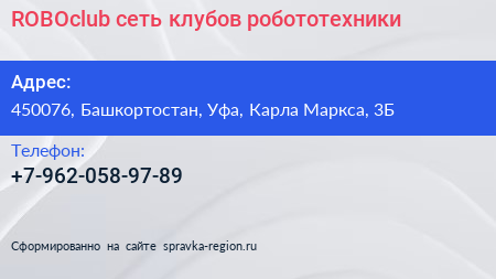 ROBOclub, сеть клубов робототехники по адресу 450076, Башкортостан, Уфа, Карла Маркса, 3Б в дальнейшем Организация, размещена в следующих категориях:
