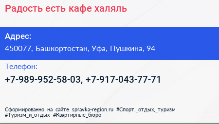 Радость есть, кафе-халяль по адресу 450077, Башкортостан, Уфа, Пушкина, 94 в дальнейшем Организация, размещена в следующих категориях: