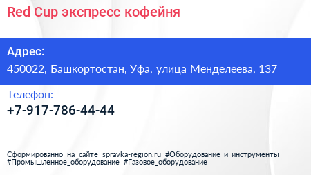 Red Cup, экспресс-кофейня по адресу 450022, Башкортостан, Уфа, улица Менделеева, 137 в дальнейшем Организация, размещена в следующих категориях: