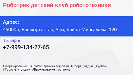 Роботрек, детский клуб робототехники по адресу 450005, Башкортостан, Уфа, улица Мингажева, 120 в дальнейшем Организация, размещена в следующих категориях: