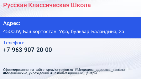 Русская Классическая Школа по адресу 450039, Башкортостан, Уфа, бульвар Баландина, 2а в дальнейшем Организация, размещена в следующих категориях: