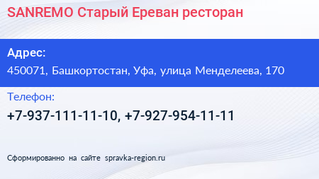 SANREMO & Старый Ереван, ресторан по адресу 450071, Башкортостан, Уфа, улица Менделеева, 170 в дальнейшем Организация, размещена в следующих категориях:
