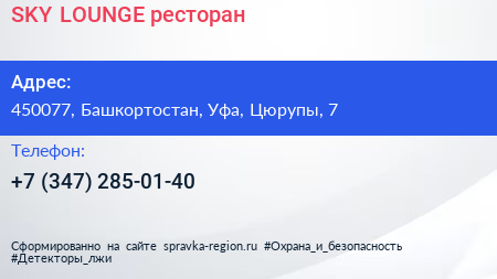 SKY LOUNGE, ресторан по адресу 450077, Башкортостан, Уфа, Цюрупы, 7 в дальнейшем Организация, размещена в следующих категориях: