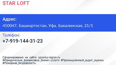 STAR-LOFT по адресу 450047, Башкортостан, Уфа, Бакалинская, 21/1 в дальнейшем Организация, размещена в следующих категориях: