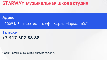STARWAY, музыкальная школа-студия по адресу 450091, Башкортостан, Уфа, Карла Маркса, 60/1 в дальнейшем Организация, размещена в следующих категориях: