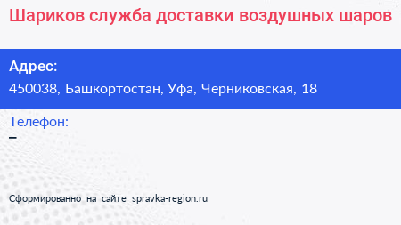 Шариков, служба доставки воздушных шаров по адресу 450038, Башкортостан, Уфа, Черниковская, 18 в дальнейшем Организация, размещена в следующих категориях: