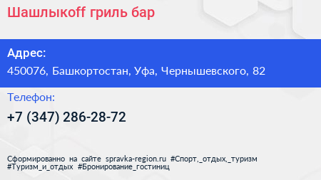 Шашлыкоff, гриль-бар по адресу 450076, Башкортостан, Уфа, Чернышевского, 82 в дальнейшем Организация, размещена в следующих категориях: