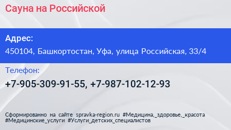Сауна на Российской по адресу 450104, Башкортостан, Уфа, улица Российская, 33/4 в дальнейшем Организация, размещена в следующих категориях: