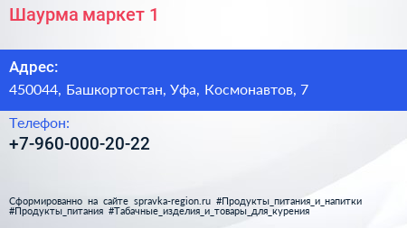 Шаурма маркет №1 по адресу 450044, Башкортостан, Уфа, Космонавтов, 7 в дальнейшем Организация, размещена в следующих категориях: