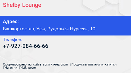 Shelby Lounge по адресу Башкортостан, Уфа, Рудольфа Нуреева, 10 в дальнейшем Организация, размещена в следующих категориях: