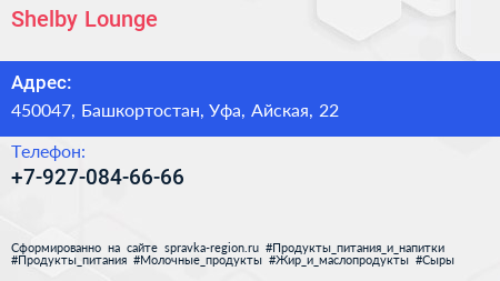 Shelby Lounge по адресу 450047, Башкортостан, Уфа, Айская, 22 в дальнейшем Организация, размещена в следующих категориях: