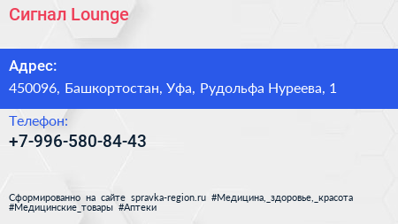 Сигнал Lounge по адресу 450096, Башкортостан, Уфа, Рудольфа Нуреева, 1 в дальнейшем Организация, размещена в следующих категориях: