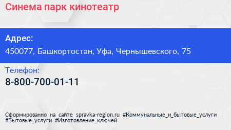 Синема парк, кинотеатр по адресу 450077, Башкортостан, Уфа, Чернышевского, 75 в дальнейшем Организация, размещена в следующих категориях: