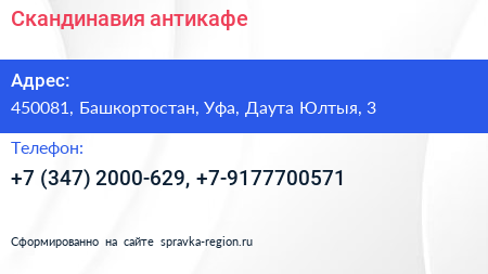 Скандинавия, антикафе по адресу 450081, Башкортостан, Уфа, Даута Юлтыя, 3 в дальнейшем Организация, размещена в следующих категориях: