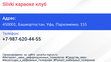 Slivki, караоке-клуб по адресу 450001, Башкортостан, Уфа, Пархоменко, 155 в дальнейшем Организация, размещена в следующих категориях:
