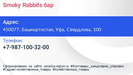 Smoky Rabbits, бар по адресу 450077, Башкортостан, Уфа, Свердлова, 100 в дальнейшем Организация, размещена в следующих категориях: